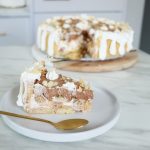 - Ρίχνουμε την καφέ σαντιγί πάνω στην τούρτα, και απλώνουμε καλά με ένα κουτάλι.